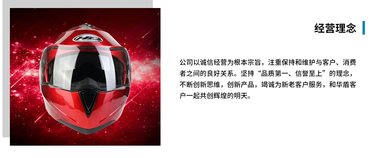 金华市华盾摩托车用品有限公司拥有18年生产历史,是浙江省头盔专业制造商之一。公司座落于浙江省兰溪市经济开发区,公司占地面积20000平方米,年生产能力800000顶。