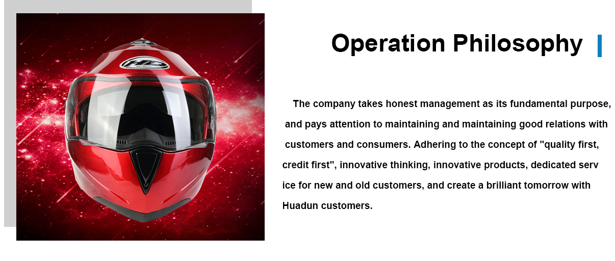 Jinhua Huadun Motorcycles Articles Co., Ltd. (original name was Wenzhou Huadun Motorcycles Articles Co., Ltd.) was established in 1987. Our company is located in the economic development zone of Lanxi City, with a land area of 20,000 square meters. Our company specializes in producing motorcycle articles such as tool cases, motorcycle helmets, ATV helmets, horse riding helmets, cross helmets, skating helmets, sports helmets, safety helmets, work helmets and police helmets. We introduce nationally and internationally advanced production and quality control equipment, which enhances our capability of production and quality control in a large scale. Our annual output is more than 800,000 pieces of all kinds of motorcycle helmets, and 400,000 pieces of tool cases....